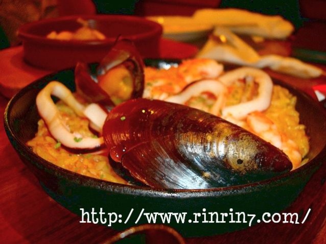 ムール貝、イカ、海老が入ったサフランライスのパエリア。