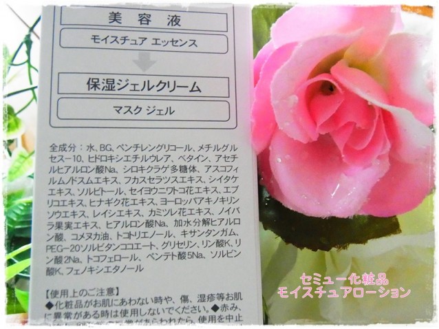 水、BG、ペンチレングリコール、メチルグルセス-10、ヒドロキシエチルウレア、ベタイン、アセツルヒアルロン酸Na、シロキクラゲ多糖体、アスコフィルムノドスムエキス、フカスセラツスエキス、シイタケエキス、ソルビトール、セイヨウニワトコ花エキス、エブリコエキス、ヒナギク花エキス、ヨーロッパアキノキリンソウエキス、レイシエキス、カミツレ花エキス、ノイバラ果実エキス、ヒワルロン酸Na、加水分解ヒアルロン酸、コメヌカ油、トコトリエノール、キサンタンガム、PEG-20ソルビタンココエート、グリセリン、リン酸K、リン酸2Na、トコフェノール、ペンテト酸5Na、ソルビン酸K、フェノキシエタノール